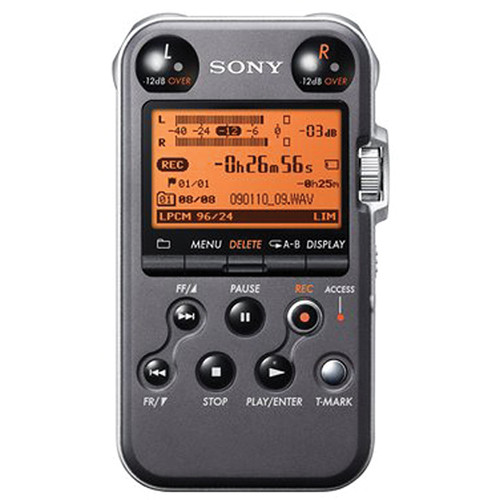 The black PCM-M10 from Sony is a compact digital audio recorder that packs a wealth of features into a rugged design. The PCM-M10 can record MP3 or WAV files at rates up to 24-bit/96 kHz. The stereo audio files can be stored on the 4GB of internal flash memory, or to a removable microSD or Memory Stick Micro card. The unit has built-in microphones for stereo recording, as well as 3.5mm mic- and line-input jacks for connecting an external mic, portable music player, and more.